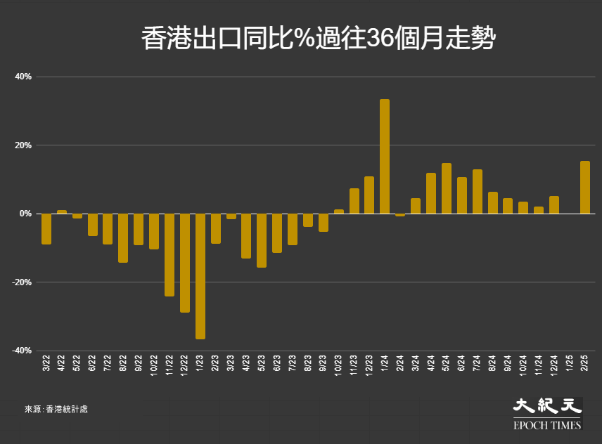 香港政府統計處於25日公布最新商品貿易數字,2月份錄得貿易逆差363億港元,1月時為順差21億港元,而去年同期亦錄逆差417億港元。於貿易數據當中,出口按年上升15.4%,上月同比升0.1%;入口則按年增11.8%,上月同比錄升幅0.5%。
