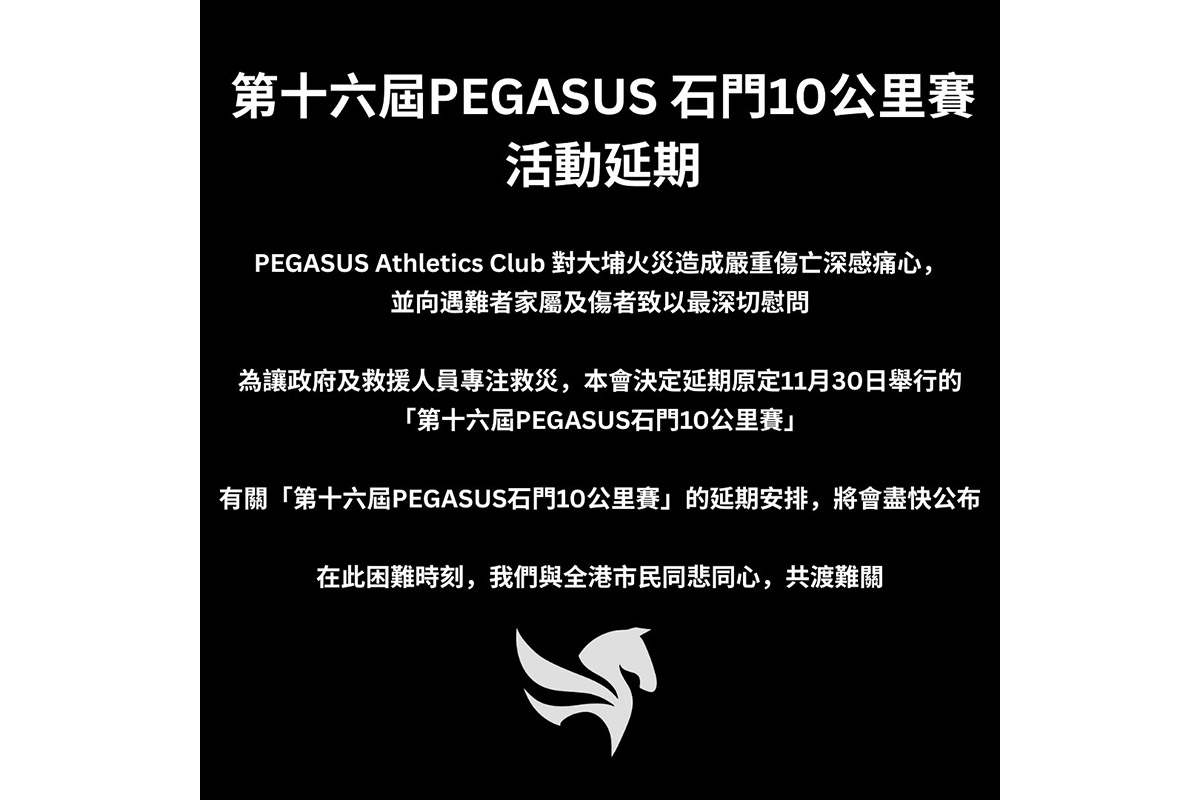 另外,贊助賽事的「石門10公里賽」Pegasus Athletics Club表示,對大埔火災造成的嚴重傷亡深感痛心,並向遇難者家屬及傷者致以最深切慰問。為讓政府及救援人員專注救災,決定「第十六屆Pegasus 石門10公里賽」延期,延期的安排會儘快公布。