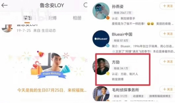 此外,于朦朧遇害死亡牽出的「17人名單」中的編劇和導演方勵,也被發現在魯念安的關注名單中,更曾轉推魯念安的微博。