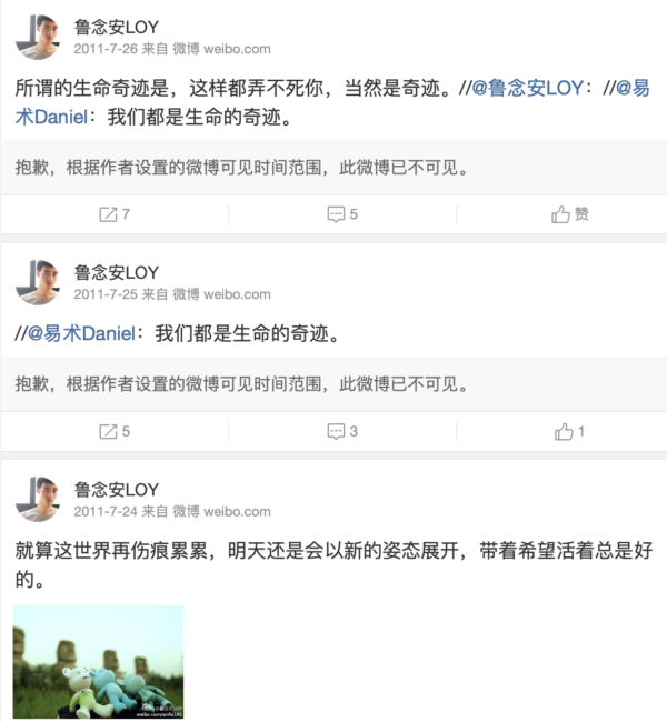 魯念安的微博紀錄顯示,魯念安生前同易術有多次互動,也曾推薦過易術的書。
