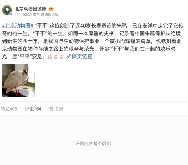 12月1日,北京動物園在微博上寫道:「平平」這位創造了近40歲長壽奇蹟的朱䴉,已在安詳中走完了它傳奇的一生。「平平」的一生如同一本厚重的史書,記錄著中國朱䴉保護從絕境到新生的40年,是中國野生動物保護事業一個微小而輝煌的篇章。