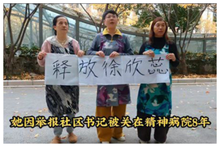 即使官方否認一切指控,民間對俆欣蕊的營救行動仍在持續,江蘇無錫維權人士丁紅芬和李旭芳、蔣建英特別錄影片表達支持,她們拉著「釋放徐欣蕊」的直幡說,「她因舉報社區書記被關精神病院8年,我們若選擇沉默,最終落到你我頭上時,我們還能向誰呼喊?她雖然沒有家人,我們都是她的親人。關心她就是關心我們自己!」#