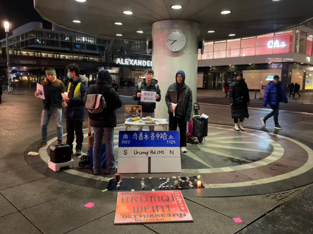 11月26日,旅居柏林的蘇雨桐與兩名友人前往中共駐德國大使館,悼念烏魯木齊大火與香港火災的罹難者。(蘇雨桐提供)