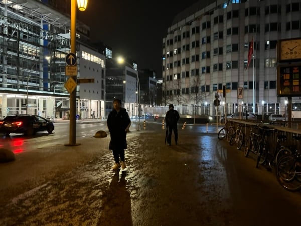 11月26日,旅居柏林的蘇雨桐與兩名友人前往中共駐德國大使館,悼念火災受難者,發現大使館走出的人對她們拍照。(蘇雨桐提供)
