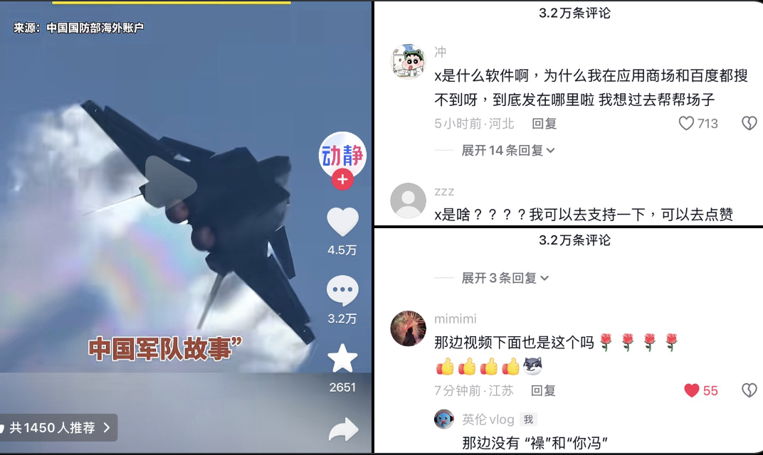 中共國防部在X開通官方帳號的消息傳回中國抖音平台,評論區炸開了。許多網民紛紛留言:「X是甚麼啊?我也想支持一下官方,官方教我怎麼下載」、「官方怎麼翻牆的,穩定嗎?推薦一下」、「X是甚麼APP啊?為甚麼我在應用商店和百度都搜不到,到底發在哪裏,我想過去幫幫場子。」