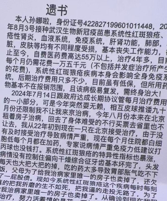 湖北女孩孫娜啦接種武漢生物疫苗後身患重病,近期在北京就醫期間,遭到原籍及北京住地警察的雙重維穩。在多年病痛與長期打壓的重壓下,她一度絕望到寫下遺書,欲結束生命。