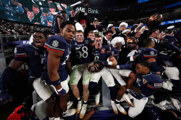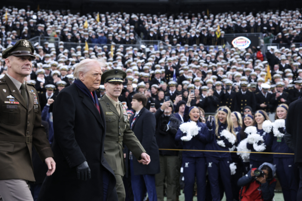 特朗普隨後前往海軍隊(Navy)場邊觀賽。中場期間,他依序造訪兩隊看台,並向海軍學生拋送「讓美國再次偉大」(MAGA)帽子,之後再前往陸軍隊區域。