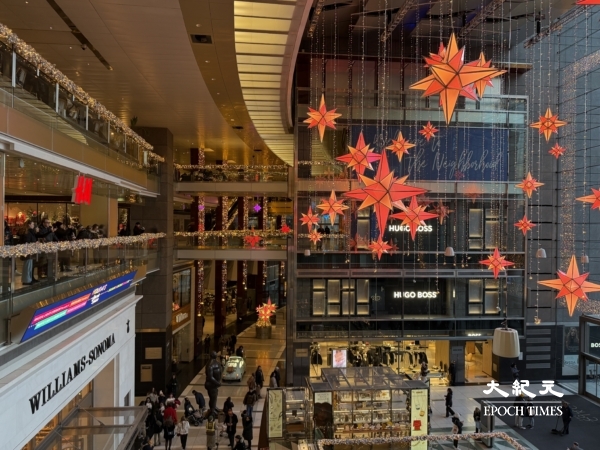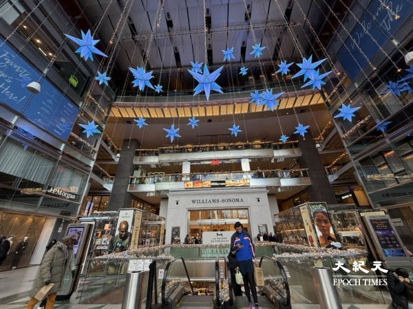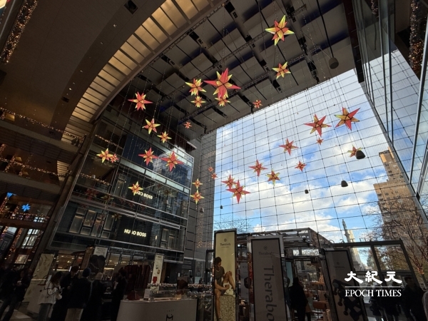 從第五大道一路走到哥倫布圓環,時代華納中心(Time Warner Center)從內至外已換上節日的外衣,商場外火樹銀花十分亮眼,哥倫布圓環名店街商場內化身成一座光影劇院:超過30萬盞燈光在透明穹頂下閃爍,44顆巨型懸空星星懸掛在半空,隨著樂曲變換粉紅、金色、藍紫等多種夢幻色調。