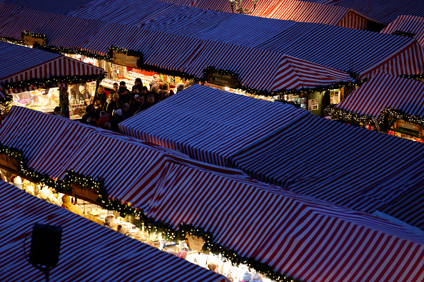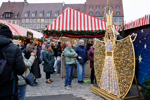 2025年11月28日,在德國紐倫堡聖誕市集正式開幕前,遊客在攤位間穿梭。(Alexandra BEIER / AFP via Getty Images)