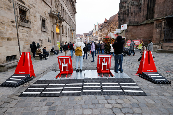 2025年11月28日,在德國紐倫堡聖誕市集正式開幕前,可以看到移動式車輛防撞屏障。(Alexandra BEIER / AFP via Getty Images)