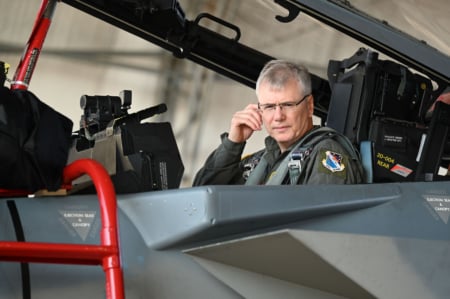 2025年11月21日,美國空軍部長梅因克在佛羅里達州埃格林空軍基地進行體驗飛行前,坐在F-15EX「鷹II」戰鬥機的駕駛艙內。(U.S. Air Force photo by Senior Airman Abigail Duell)