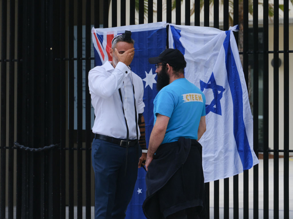 12月14日傍晚,在悉尼著名的邦岱海灘發生了一宗反猶太槍擊事件,其中16人喪生,42人受傷。圖為澳洲猶太人執行委員會聯合行政總裁亞歷克斯·里夫欽(Alex Ryvchin 左)15日在邦迪海灘的邦迪亭前哀悼。(Photo by George Chan/Getty Images)