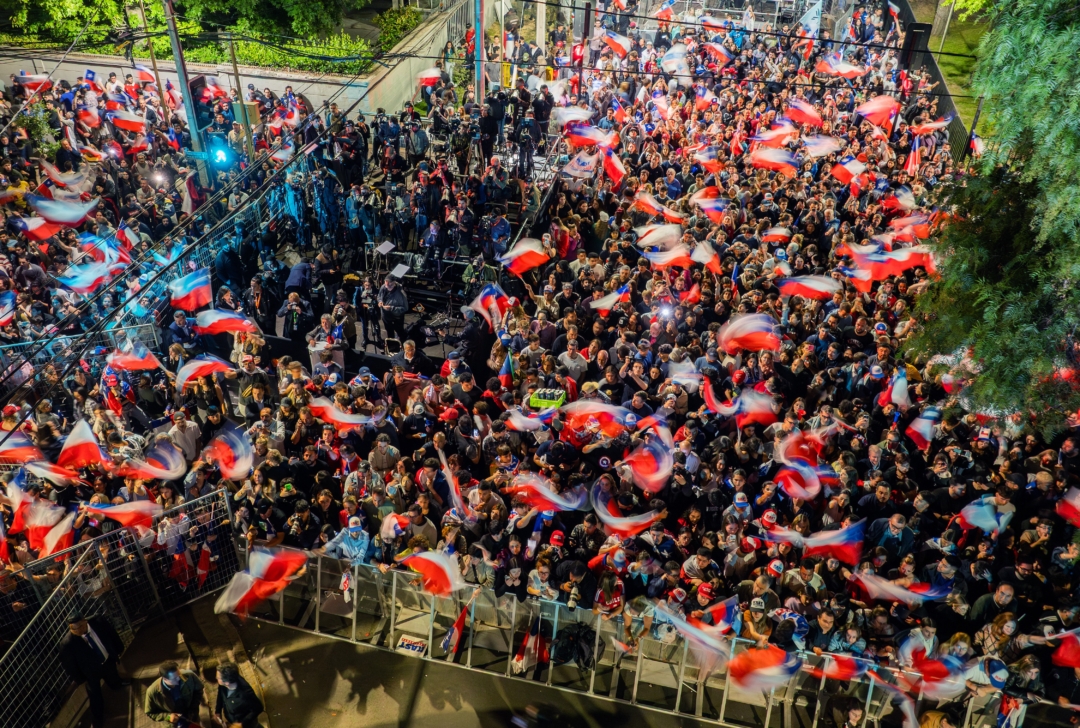 在慶祝勝利的集會上,一些支持者揮舞著智利國旗,並戴著印有「讓智利再次偉大」(Make Chile Great Again)字樣的紅色帽子。