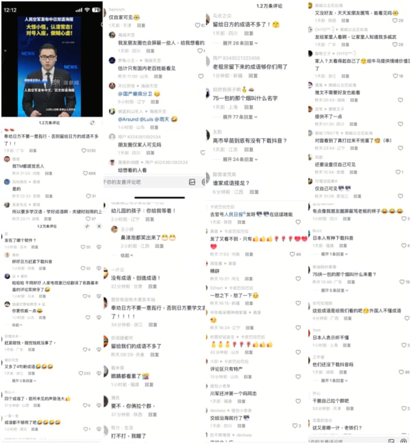 很多網民評論諷刺軍方上述言論都是針對大陸人抖威風,而日本政府根本沒機會看到:「給想看的人看。」「收到,立馬通知日方下載抖音!」「高市早苗到底有沒有下載抖音?」 「發給家裏人看啊,讓家裏人知道我多威武!」「乾脆自己拉個群吧!」「要不你倆拉個群?」