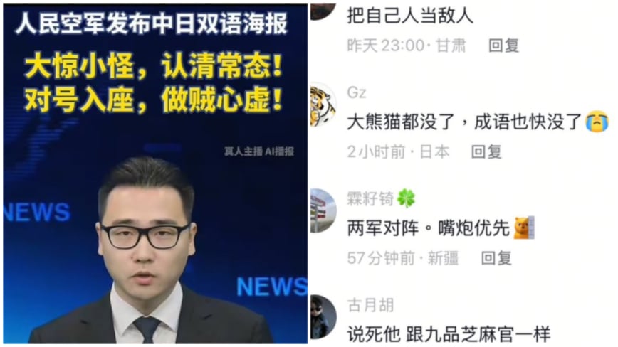 繼中共國防部在X開帳戶遭到群諷後,中共空軍近日發布的一條針對日本的「中日雙語海報」,也引發網上一片嘲諷,讓人捧腹。