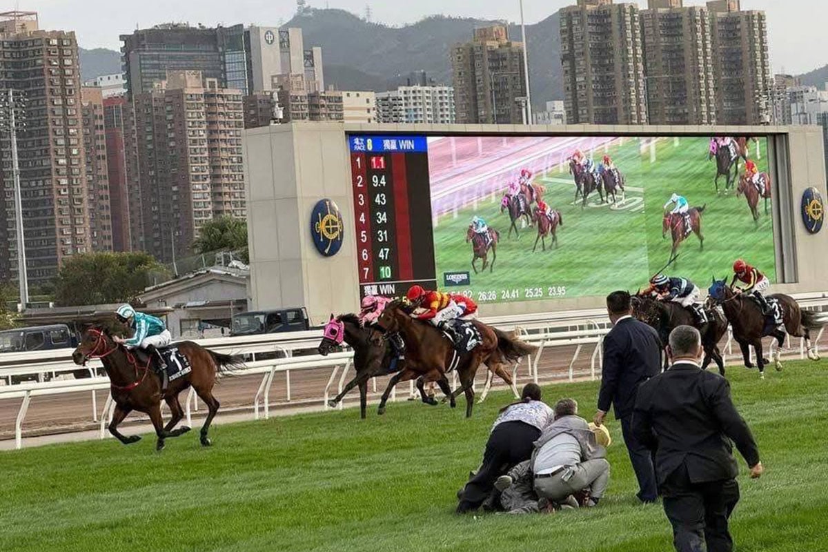 事發在周日下午近5時,沙田馬場進行「浪琴香港盃」第8場賽事期間。一名男子手持寫有「大埔宏福苑」及「落台」等字句的橫額,衝入接近終點前的賽道中央,場邊工作人員隨即上前將他制服。約20秒後,馬群抵達事發位置衝線,,待馬匹衝線後始將男子帶離,人馬皆安全。