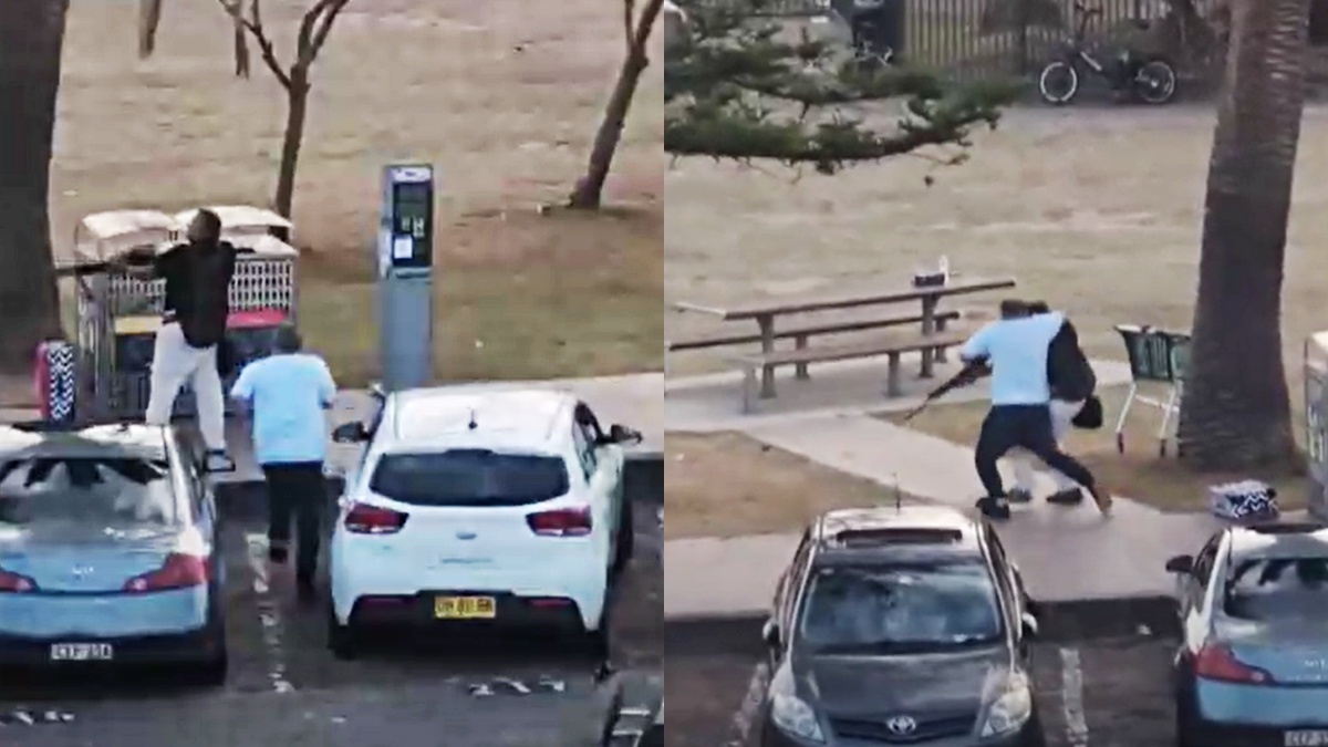 其中一名身穿黑色上衣、白色褲子的槍手,站在坎貝爾大道(Campbell Parade)停車場旁的兩個垃圾桶附近,向草坪上聚集的人群開槍。