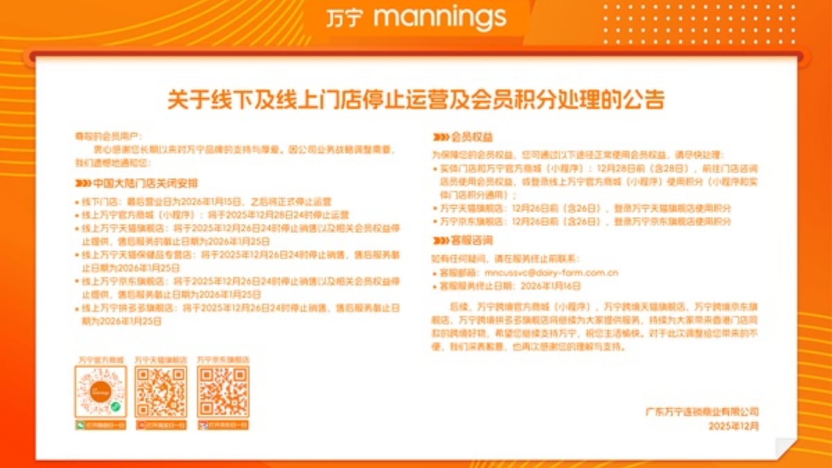 公告顯示,其線下門店最後營業日為2026年1月15日,之後將正式停止營運;線上萬寧官方商城(小程序)將於2025年12月28日24時停止營運,而天貓旗艦店、京東旗艦店、天貓保健品專營店則將在12月26日停止營運。
