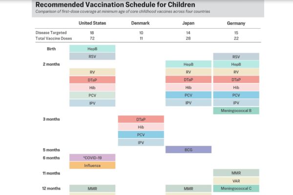 總統指出,截至1月份,美國建議兒童接種18種疾病的疫苗,而丹麥僅建議接種10種疾病的疫苗。他還提到,日本和德國的疫苗接種計劃所涵蓋的疾病種類也少於美國。