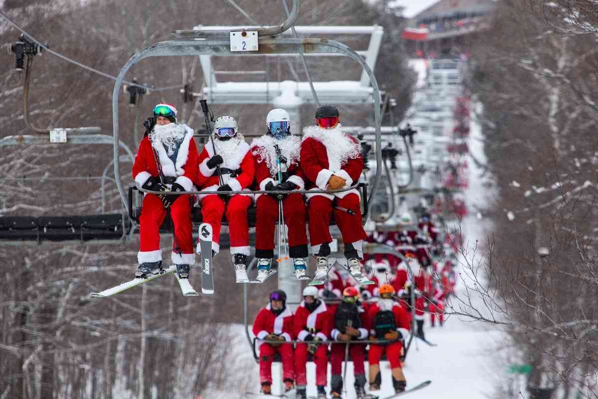 2025年12月14日,在緬因州紐里鎮的周日河河畔,超過三百名打扮成聖誕老人或其它聖誕節相關角色的民眾參加一年一度的滑雪活動。圖為聖誕老人們準備乘坐纜車上山。(Lauren Owens Lambert/AFP via Getty Images)