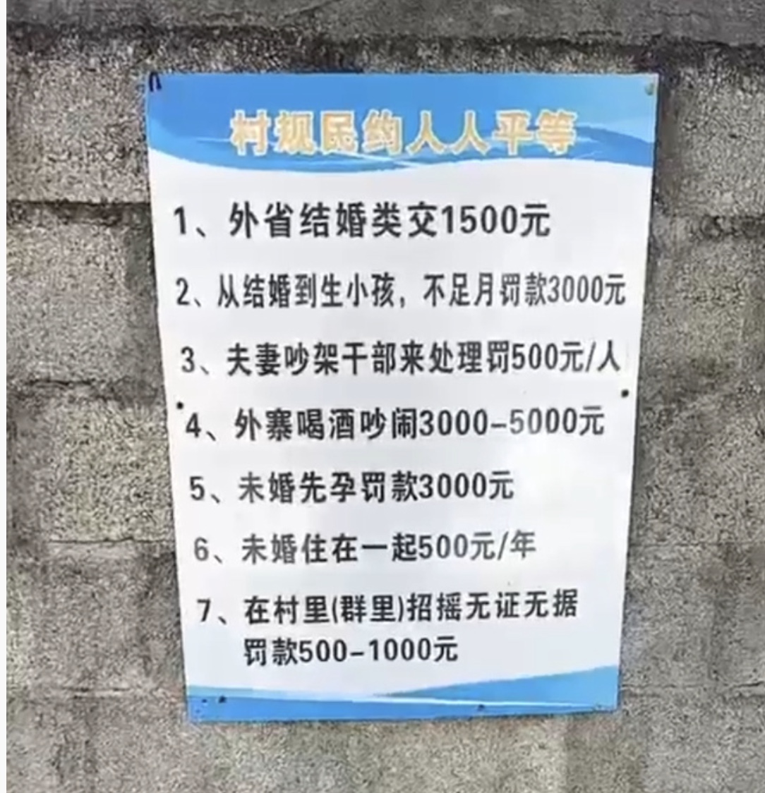 網傳圖片顯示,一張張貼在牆上的告示「村規民約」,列名了7類行為及罰款金額,包括了和外省的人結婚、夫妻吵架、未婚同居、未婚先孕,甚至還包括了在村裏或者村微信群中發言。具體內容為:「外省結婚交1500元、未婚住在一起每年500元、從結婚到生小孩,不足月罰款3000元、夫妻吵架幹部來處理罰500元/人、未婚先孕罰款3000元、在村裏(群裏)招搖無證無據罰款500~1000元。」