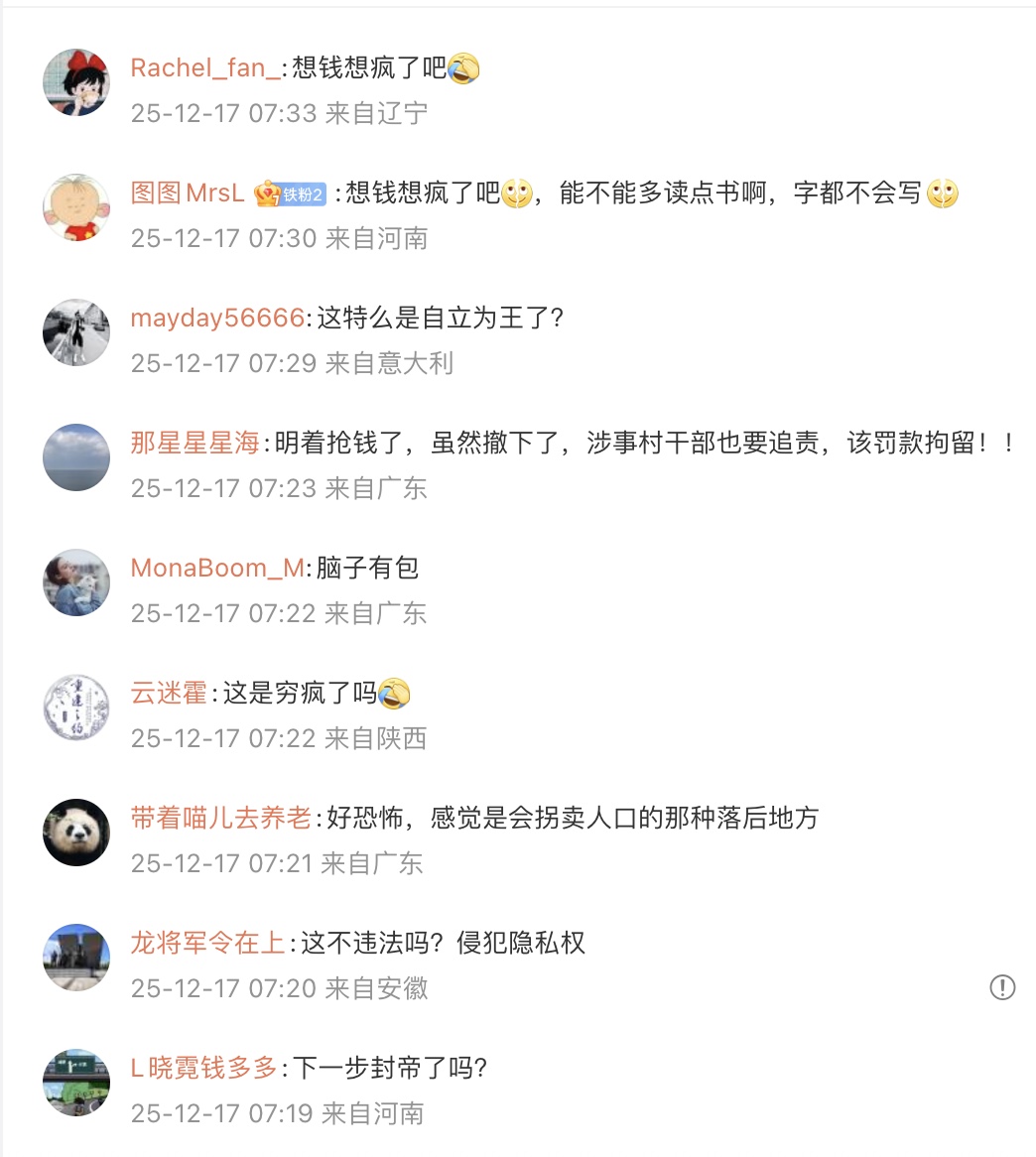 此告示引發眾多網民評論,「這真是想錢想瘋了,這是給村幹部養老錢嗎?」「想錢想瘋了。」「笑死。以後全地球的人每天早上要給我請安。不來請安的人每人罰500塊錢。」「這錢交給誰呢?而且,交錢的理由是甚麼?」