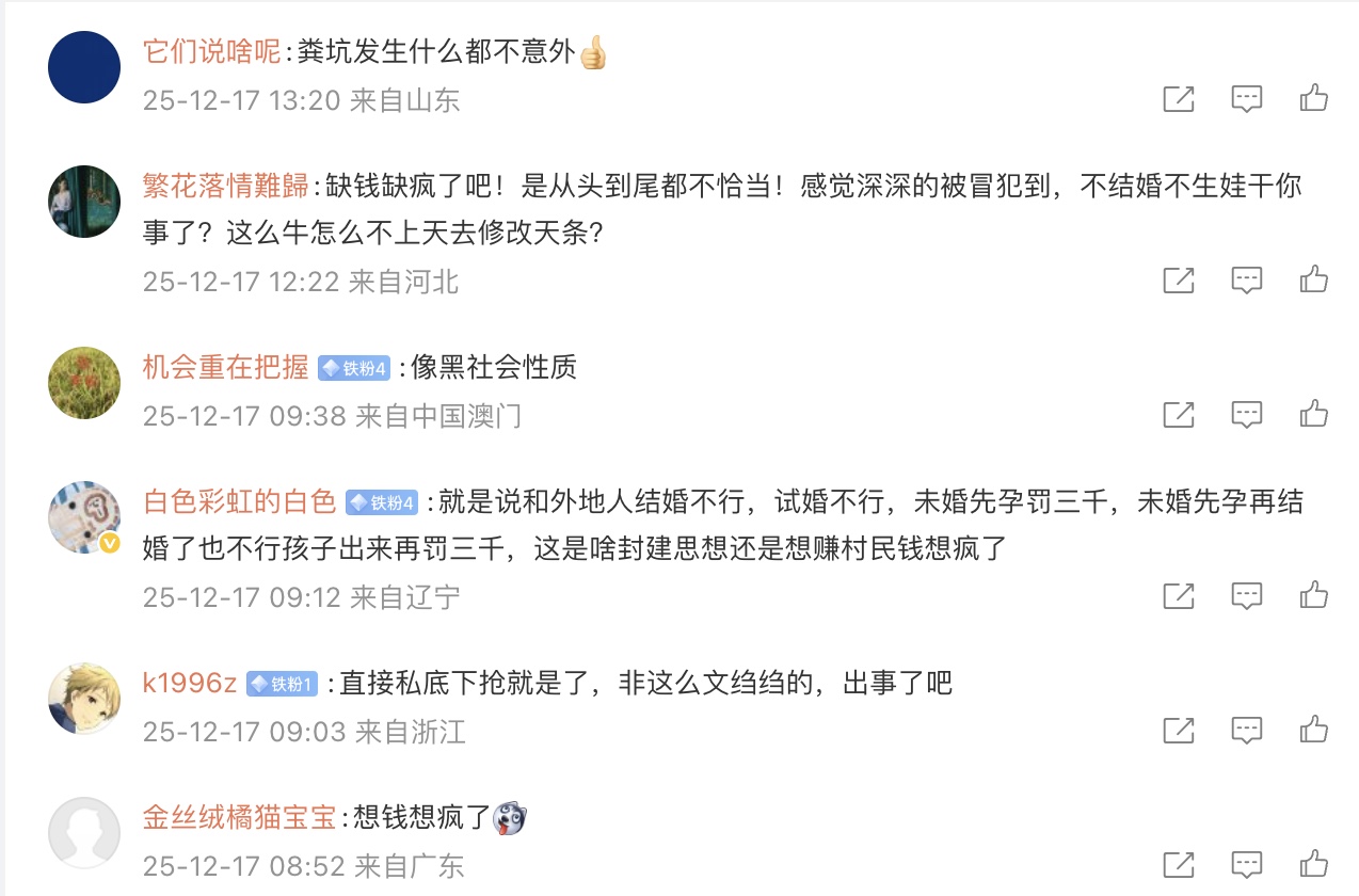還有網民指出,儘管這個告示中的大多數行為在道德上是屬於禁止性的,但是這種隨意罰款的行為違法,「這明顯違法的也敢這樣寫出來」「村規比法律還大?」「村委會作為自治組織,無權設定行政處罰。我國《行政處罰法》明確規定罰款權僅限行政機關依法行使」「誰給的權力隨意設罰? 」