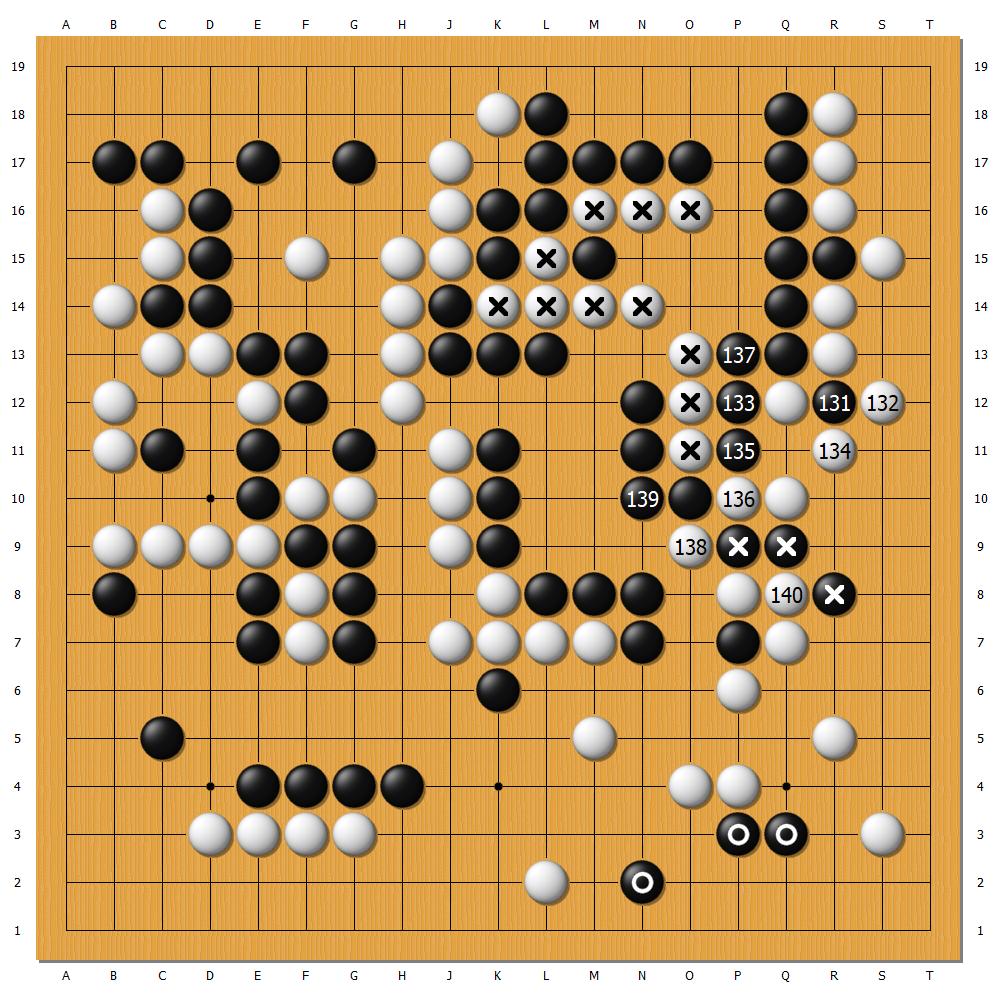 此後黑棋把握進攻節奏,步調穩健,井山裕太不甘心被「安樂死」,白132手索性棄子轉換,做殊死一搏。不過一切盡在申真諝掌握,黑棋簡明做活右下角三子,鎖定勝局。