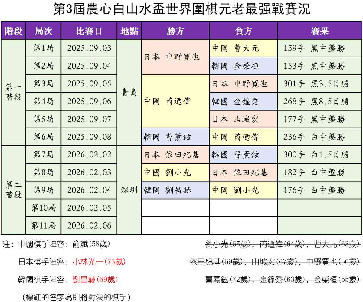 類似的劇本也出現在稍早進行的第3屆「農心白山水盃世界圍棋元老最強戰」。韓國元老隊主帥劉昌赫九段力克中國元老隊副帥劉小光九段之後,三國元老隊也都各剩一人。