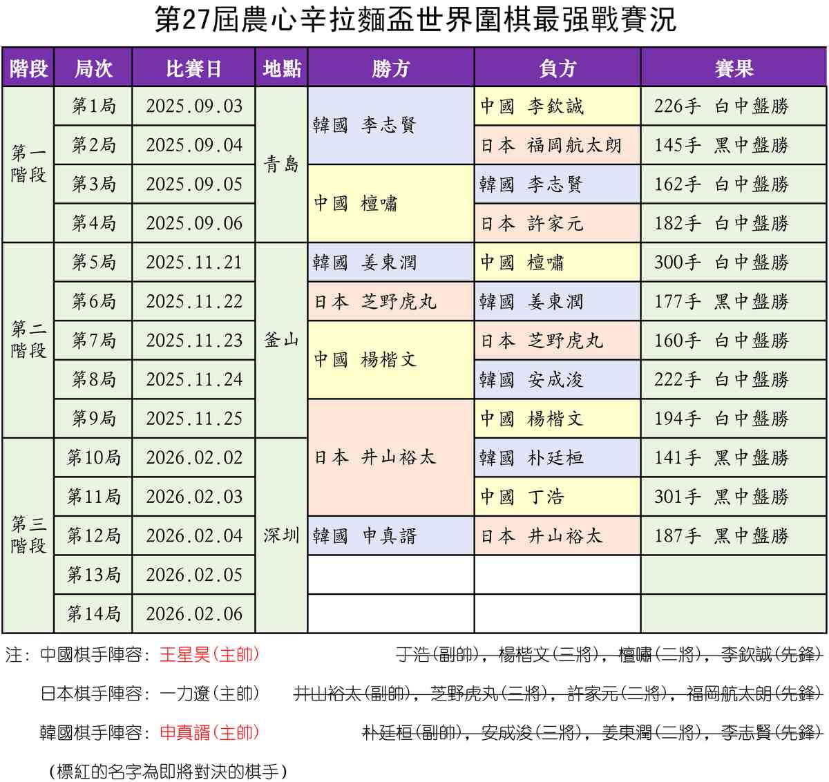 2月4日,第27屆「農心盃」三國圍棋擂台賽激戰正酣,韓國隊主帥申真諝九段完勝日本隊副帥井山裕太九段,達成跨屆19連勝。此役戰罷,三國均剩主帥一人。5日,韓、中兩隊主帥率先上演巔峰對決,勝者與日本隊主帥爭冠。