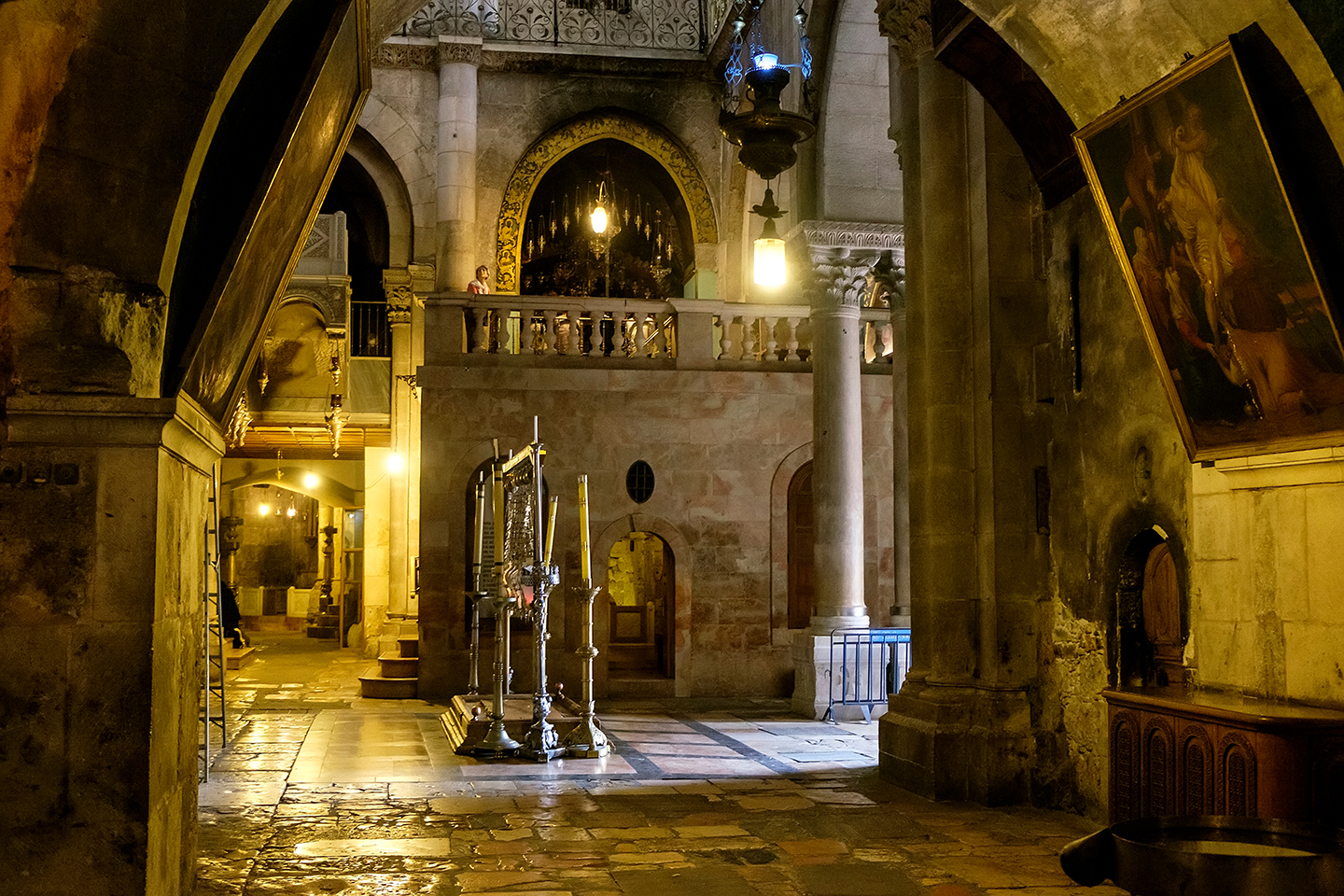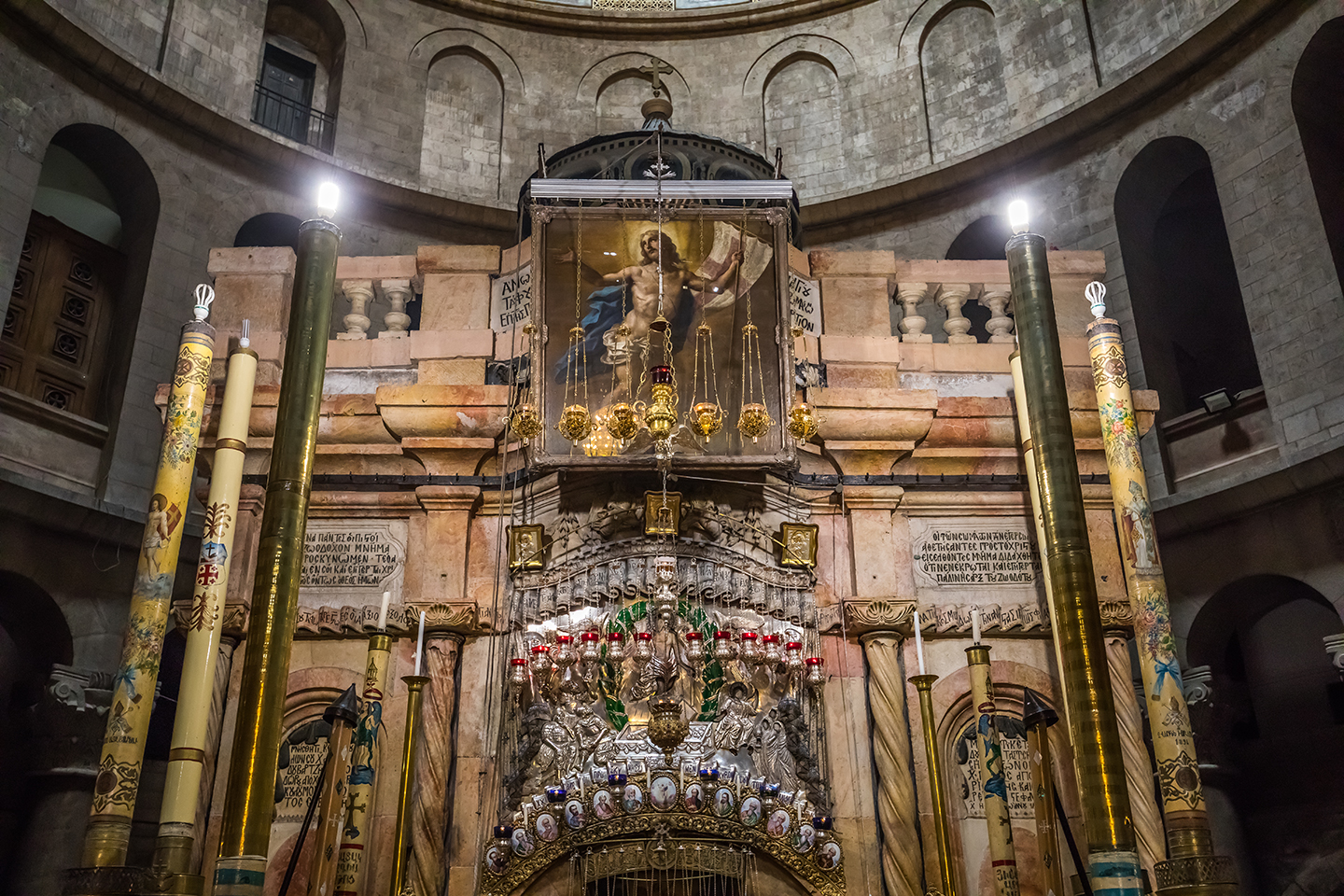 石板上擺放著立式燭台,上方懸有八個華麗燈盞,分別由亞美尼亞人、希臘人、科普特人和拉丁人捐贈——四大教派共同持有石板的所有權。