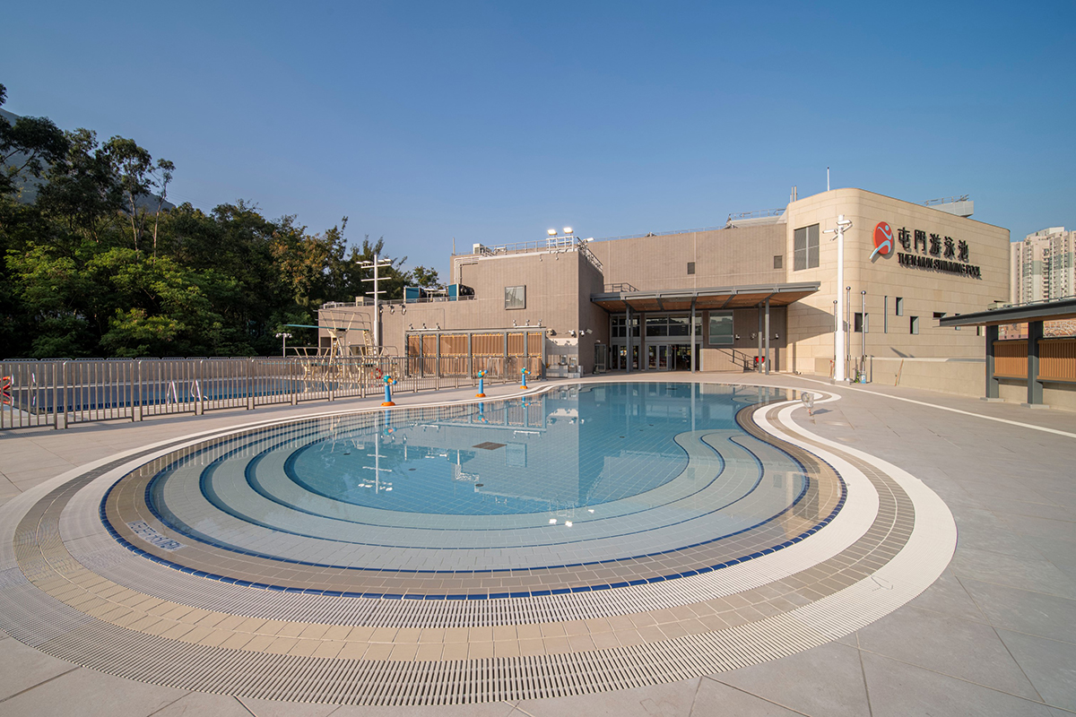 新的屯門游泳池位於輕鐵車廠站附近的屯門康樂體育中心內,港鐵表示已全面升級泳池設施,包括增設全天候室內暖水池,一共2個全天候室內暖水池及4個室外泳池,室內觀眾看台座位數目亦增加近一倍,以及加入更多無障礙設施。