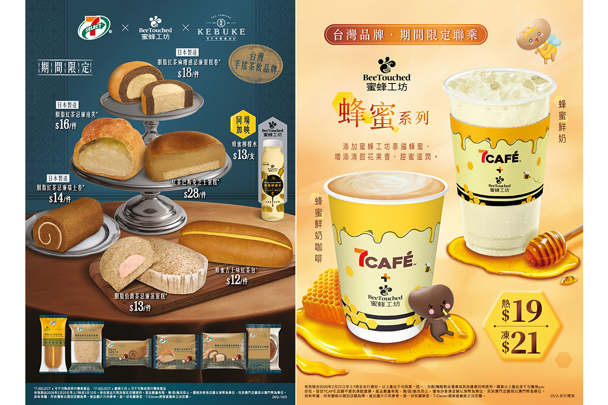 7-Eleven自家品牌7-SELECT、7CAFÉ及7 仔食檔,將與兩大台灣人氣品牌——以獨特茶飲聞名的可不可熟成茶行及嚴選天然蜂蜜的蜜蜂工坊攜手合作,推出一系列限定聯乘新品,將高品質蜂蜜和紅茶口味融入多款美食及飲品。