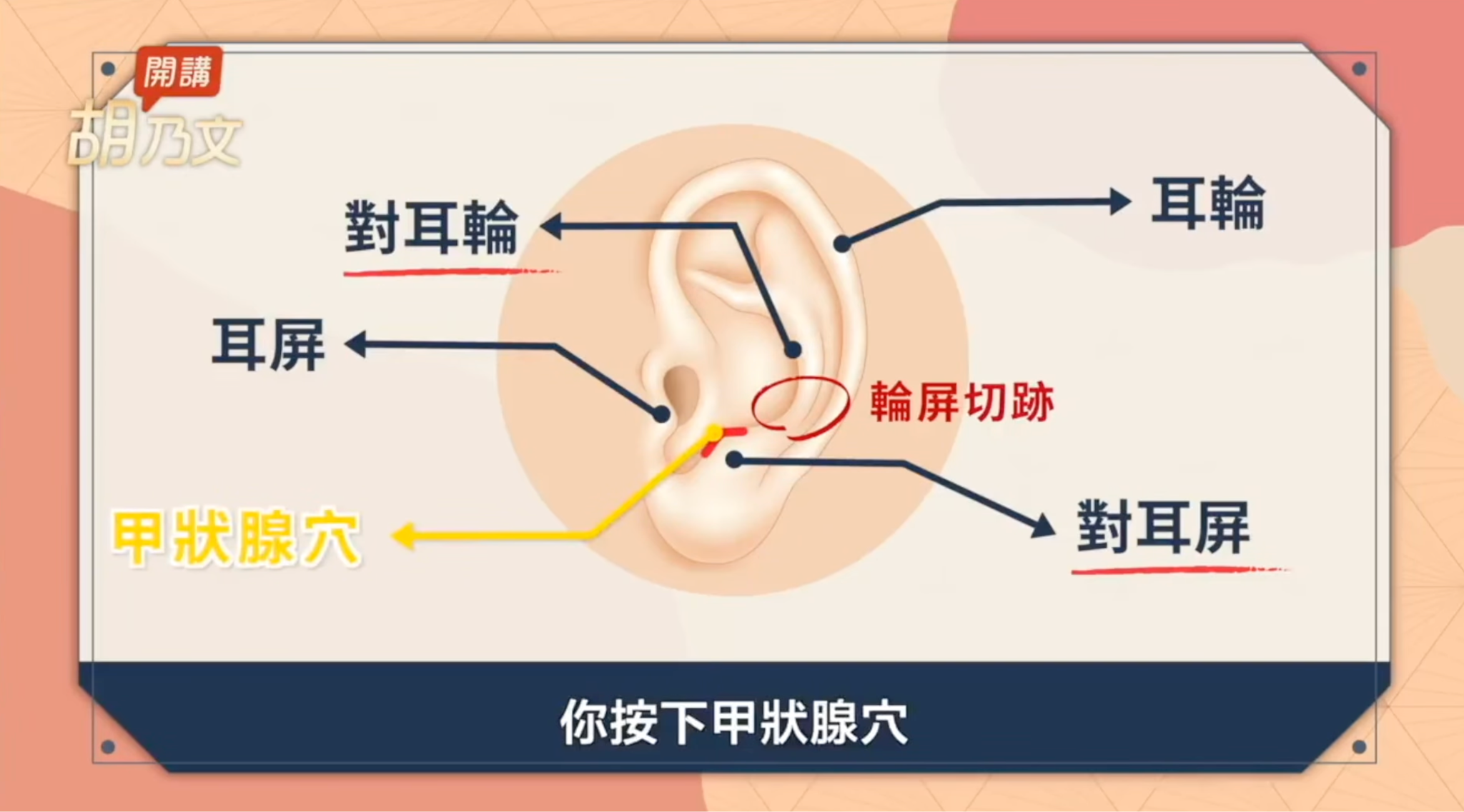 除了服用中藥之外,按摩穴位也可以起到改善甲狀腺功能的作用。中醫師胡乃文介紹,有一個對甲狀腺調節很有幫助的穴位,稱為「甲狀腺穴」,位置在耳垂上方的突起處。無論是甲狀腺功能亢進或低下,都可以透過按壓這個穴位來幫助緩解不適。