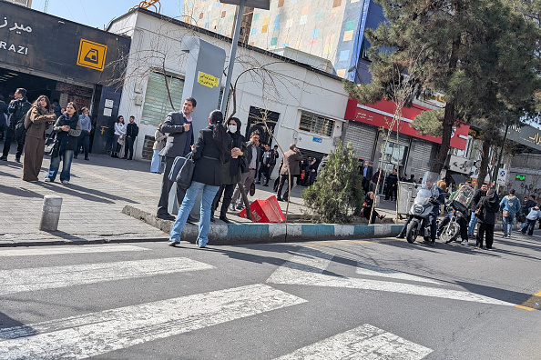 2026年2月28日,以色列對伊朗發動「先發制人」攻擊後,首都德黑蘭民眾佇足街道。(Sohrab / Middle East Images / AFP via Getty Images)