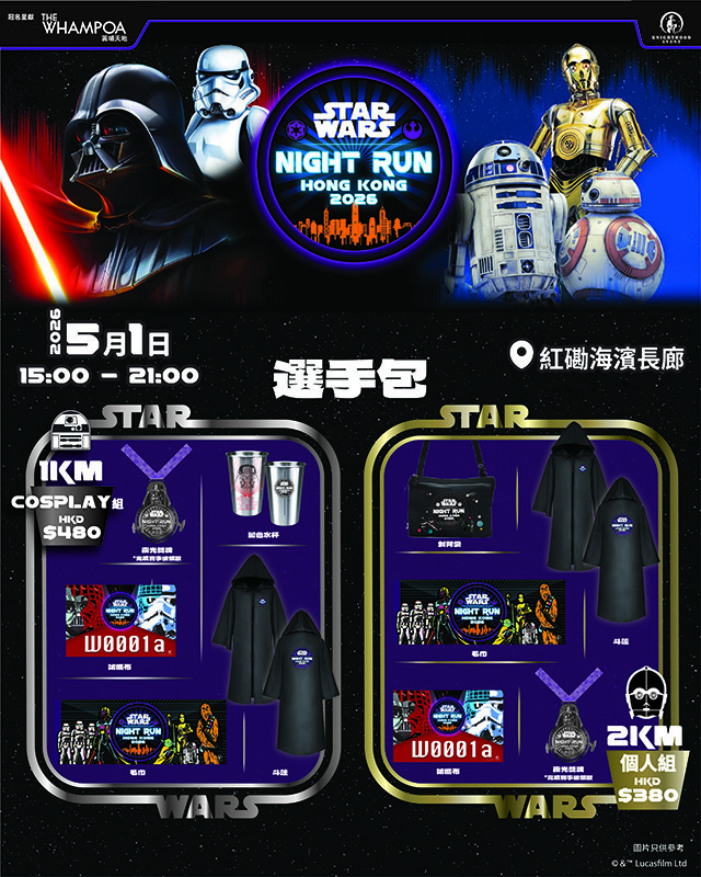 全港首個STAR WARS Night Run Hong Kong 2026 將於今年5月1日亮相黃埔海濱,集結數千名《星球大戰》(STAR WARS)的粉絲,在香港海岸線夜景映襯下,沿黃埔海濱扮演《星球大戰》系列電影中的角色,一齊跑步與玩樂。賽事分別設有1KM Cosplay組與2KM個人組,活動今日(3月1日)起接受報名,今日成功參與參與早鳥報名人士,將額外獲得別注版死星岩石杯墊。