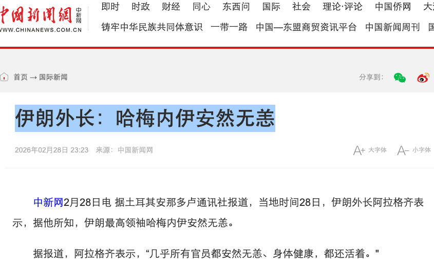 新華網在北京時間2月28日晚上11點左右說:哈梅內伊將在「幾分鐘後」發表講話。中新網說哈梅內伊安然無恙。
