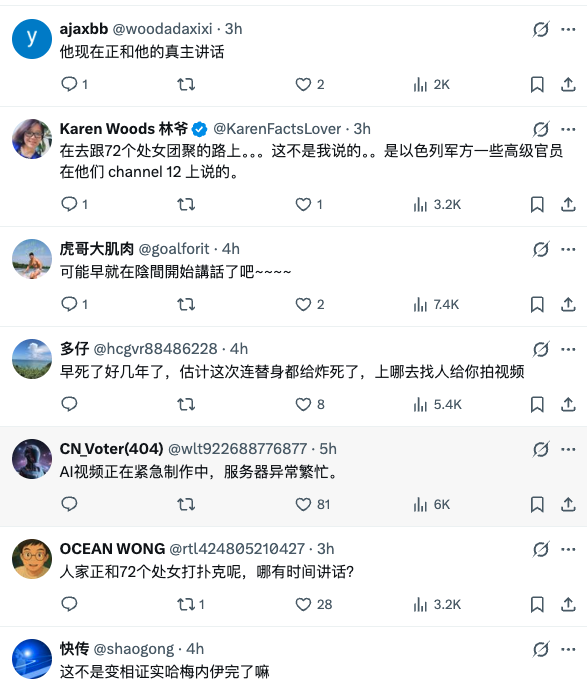 網民跟帖嘲諷:「可能早就在陰間開始講話了吧~~~~」「早死了好幾年了,估計這次連替身都給炸死了,上哪去找人給你拍影片」「AI影片正在緊急製作中,伺服器異常繁忙。」「這不是變相證實哈梅內伊完了嘛」等。#
