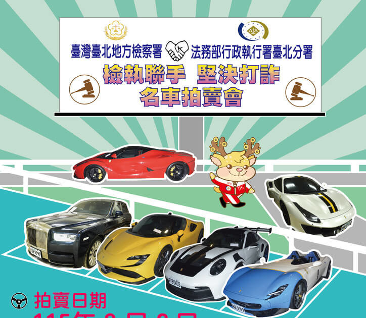 行政執行署台北分署受北檢囑託今天(3月2日)在警專舉行「聯合打詐宣示儀式暨名車拍賣會」,標的物包括太子集團案查扣的33輛名車,包括備受全球收藏家矚目的「四大神獸」等頂級超跑。