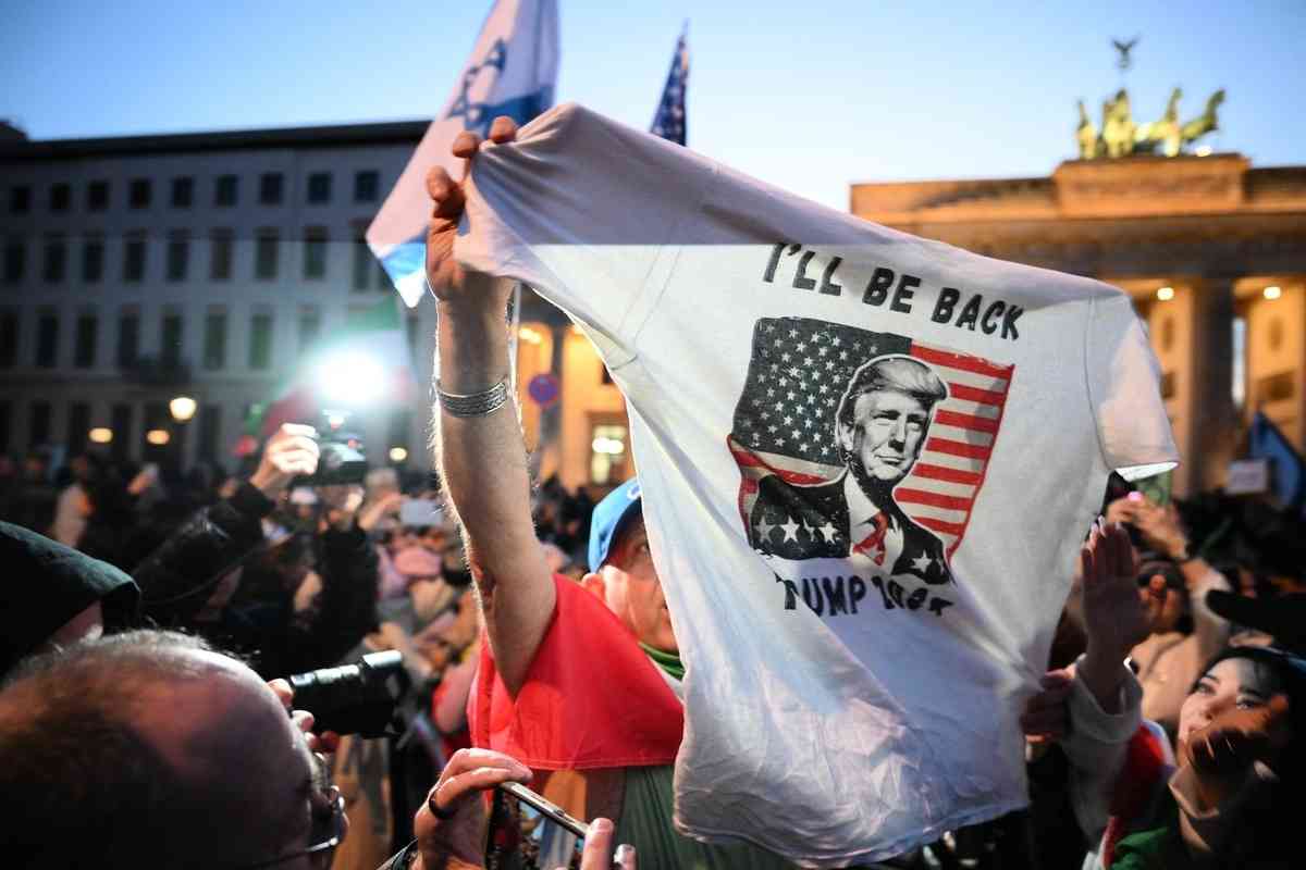 2026年2月28日,在美以對伊朗發動空襲後,大批民眾聚集在柏林勃蘭登堡門(Brandenburger Gate)前慶祝。圖為一名男子展示一件特朗普國旗襯衫。(RALF HIRSCHBERGER / AFP via Getty Images)