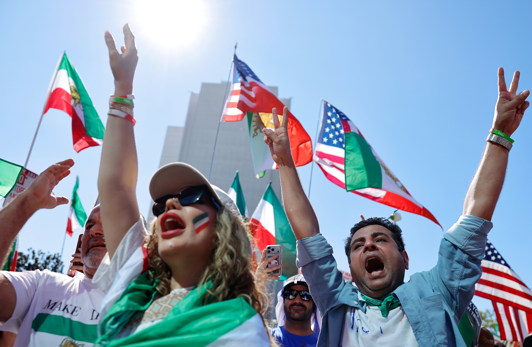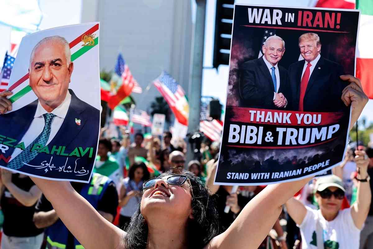 2026年2月28日,在美以對伊朗發動空襲後,大批民眾聚集在加州洛杉磯街頭慶祝。圖為一名女子雙手高舉伊朗流亡王儲巴列維(Reza Pahlavi)、美國總統特朗普和以色列總理內塔尼亞胡的肖像照。(Mario Tama/Getty Images)