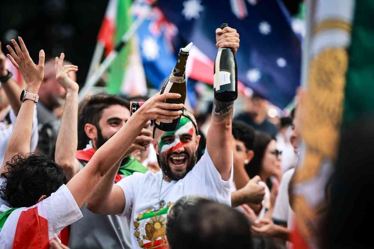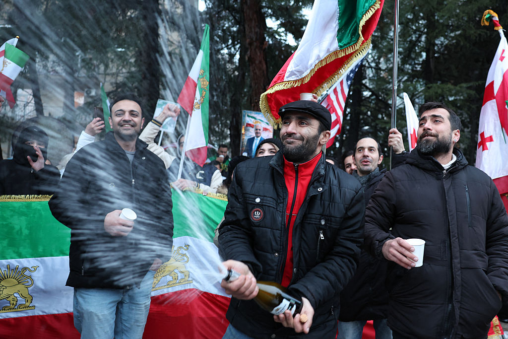 2026年2月28日,在美以對伊朗發動空襲後,伊朗僑民在第比利斯伊朗大使館前舉行集會慶祝。圖為一名男子開了一瓶香檳酒。(Giorgi ARJEVANIDZE / AFP via Getty Images)