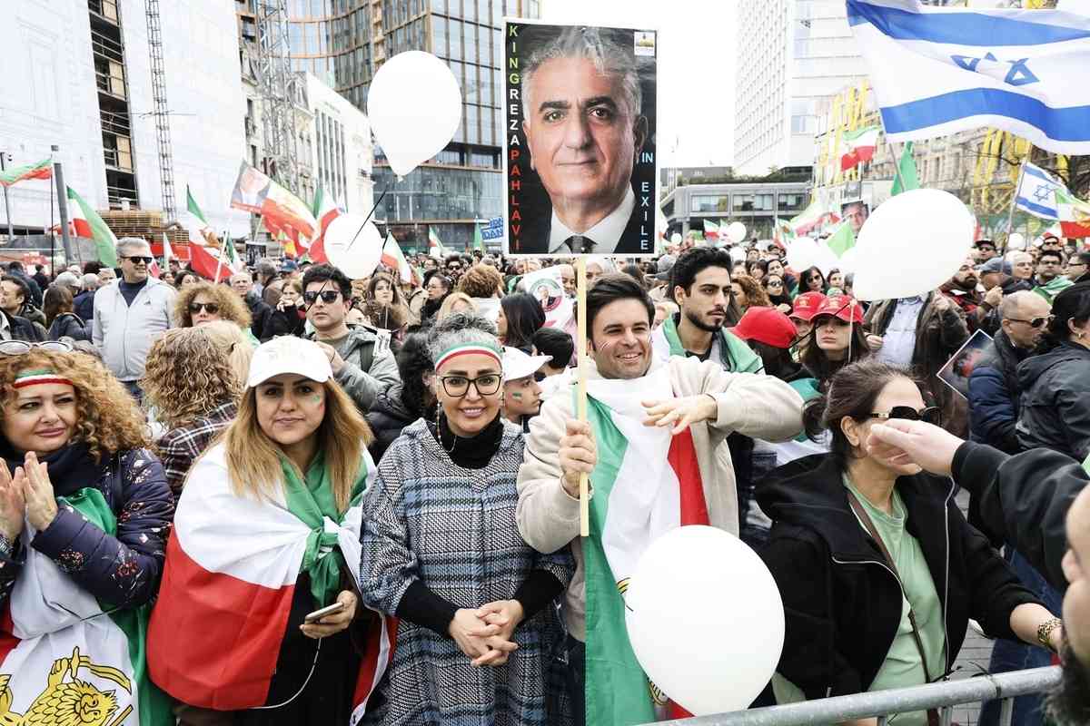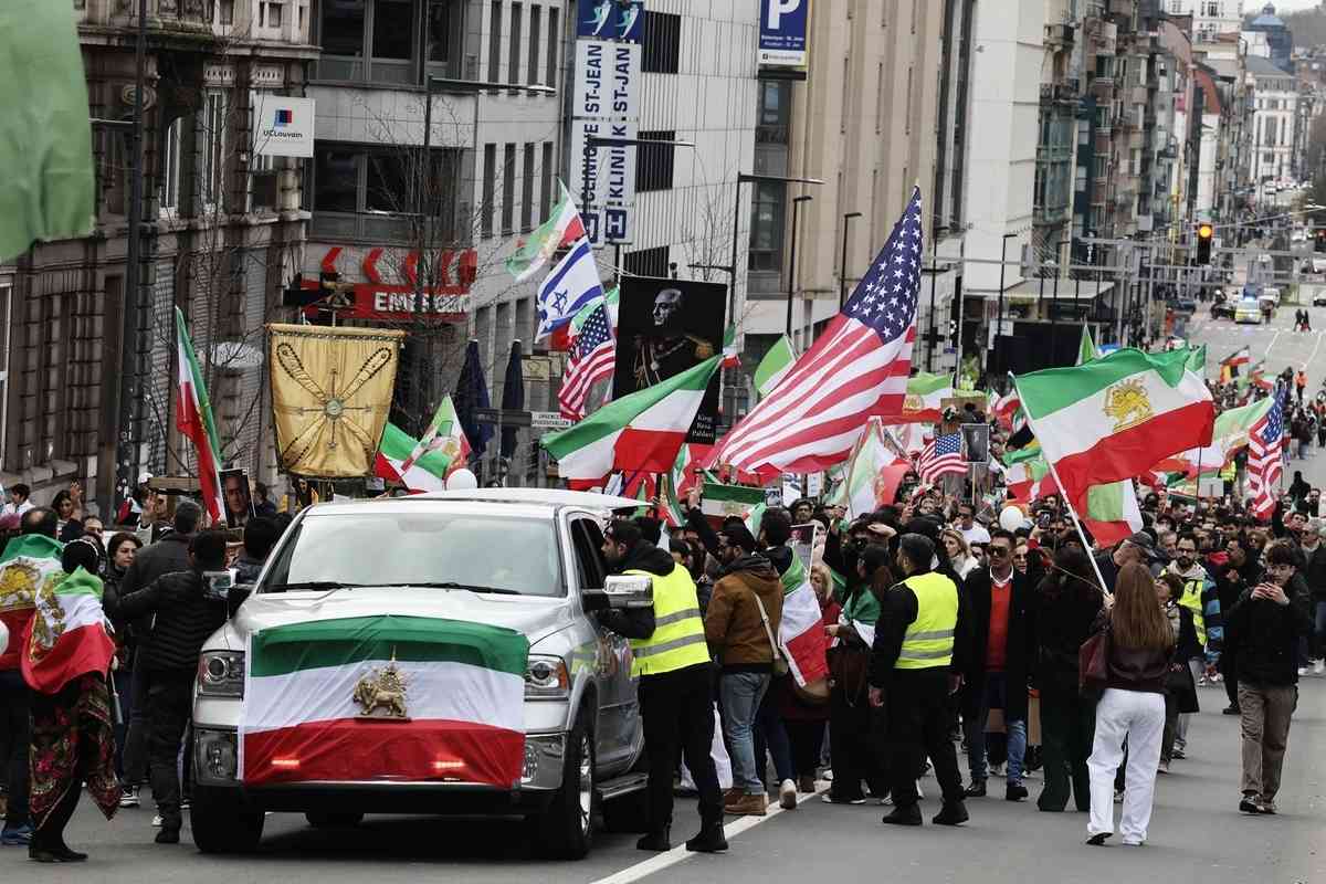 2026年3月1日,大批民眾在比利時布魯塞爾舉行集會遊行,他們高舉1979年伊朗革命之前的獅子太陽旗和伊朗流亡王儲巴列維(Reza Pahlavi)的照片,聲援伊朗國內的反政府抗議者。(Nicolas Maeterlinck/BELGA MAG/Belga/AFP via Getty Images)