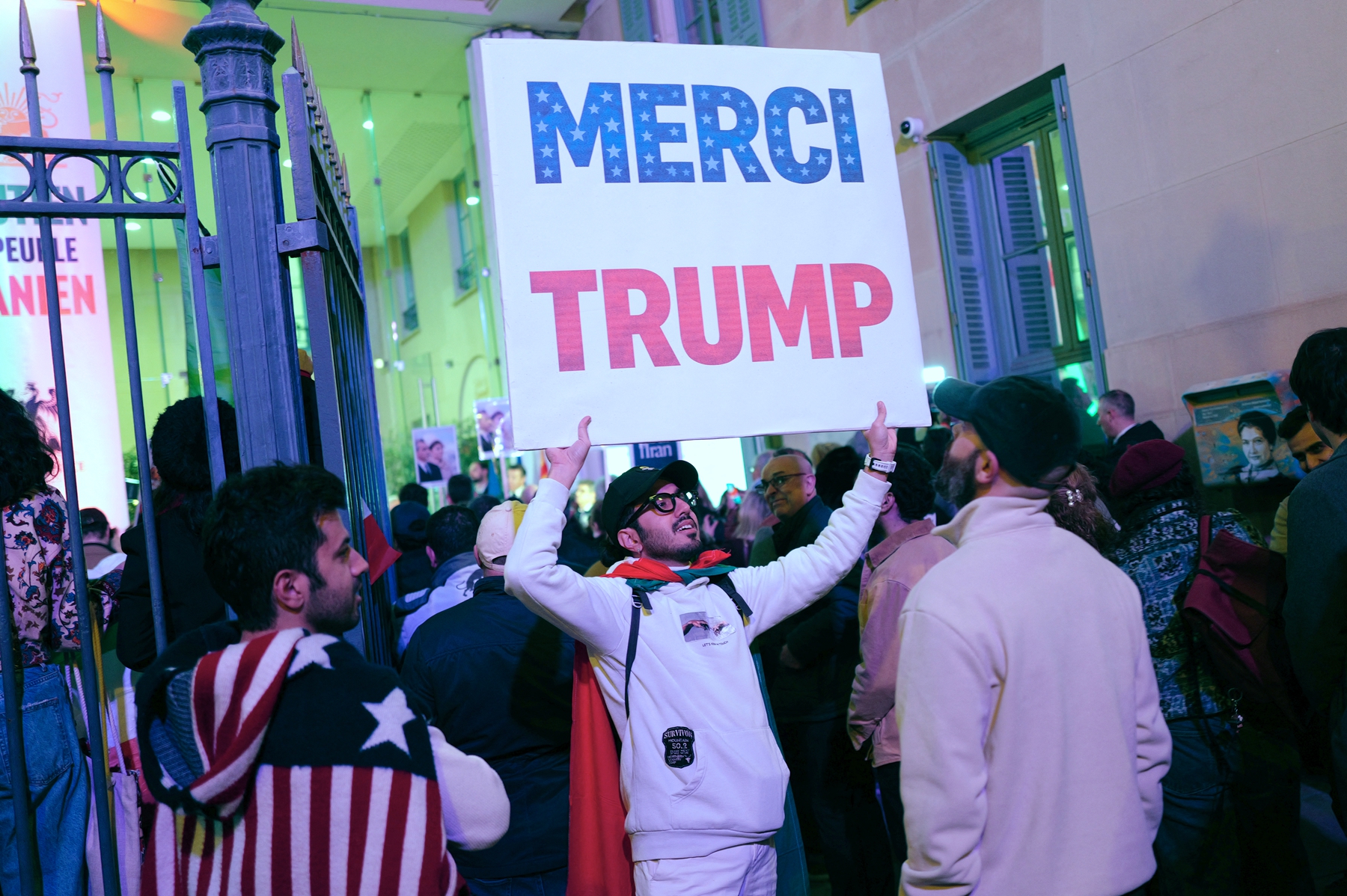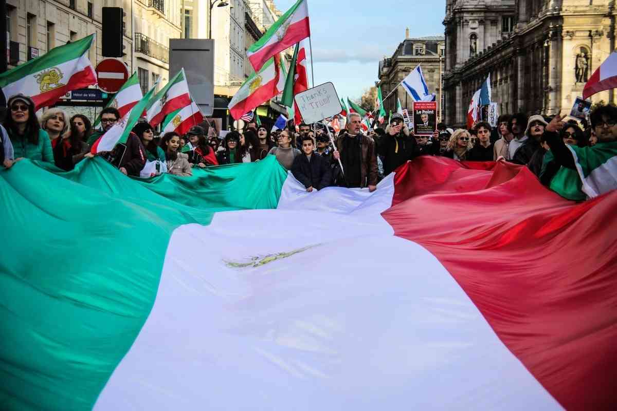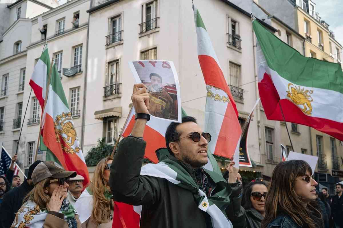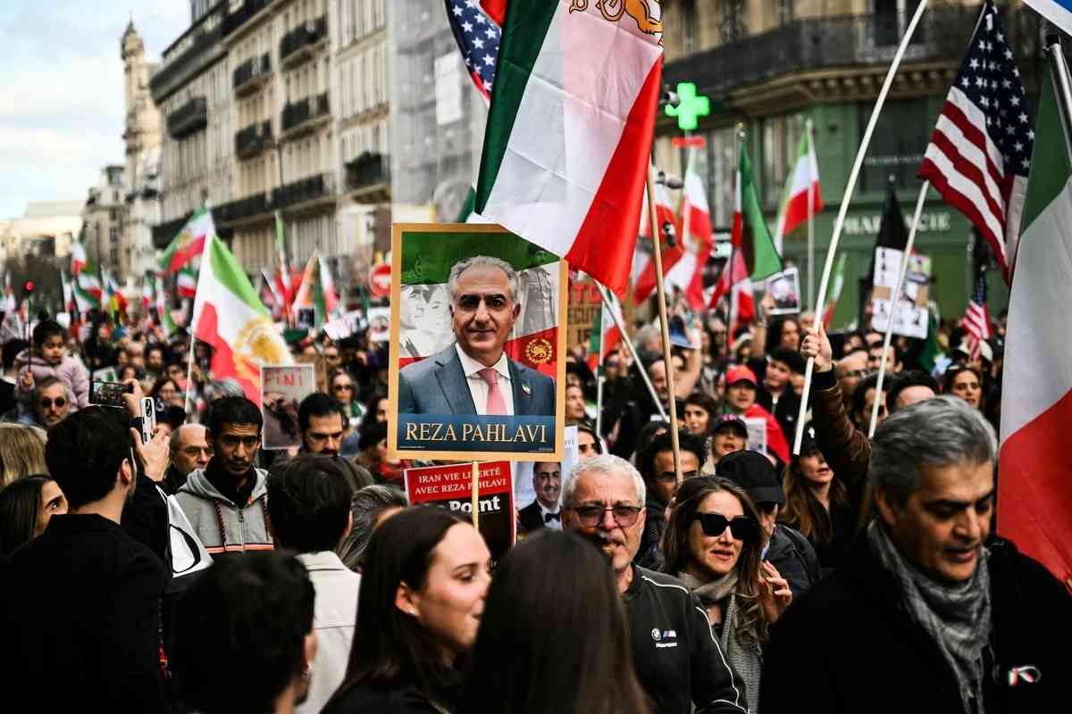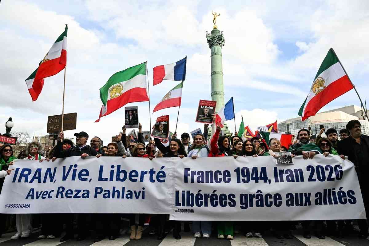 2026年3月1日,大批民眾參加在巴黎街頭舉行的集會遊行,支持美國和以色列軍事打擊伊朗並呼籲伊朗政權更迭。(Benoît Durand/Hans Lucas/AFP via Getty Images)