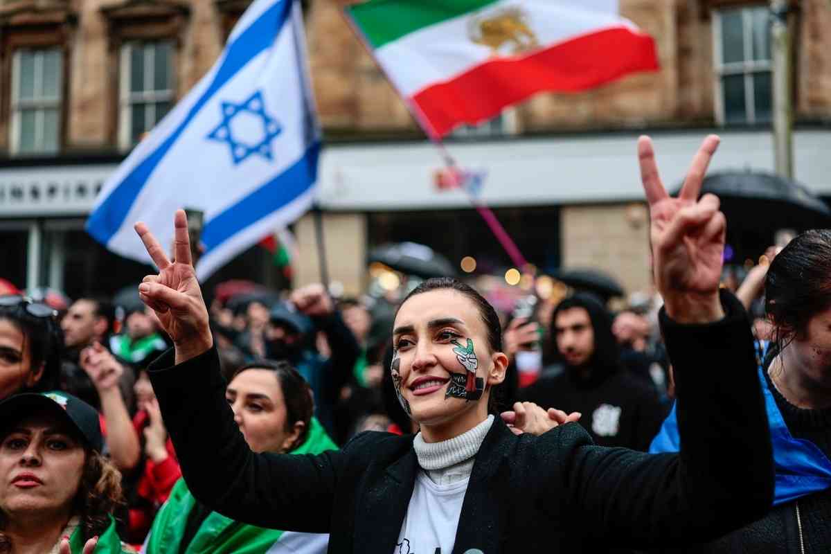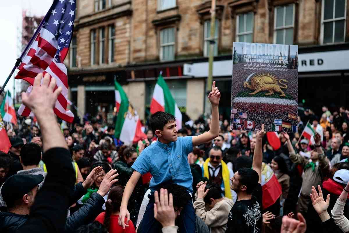 2026年3月1日,大批民眾在蘇格蘭最大城市、英國第三大城市格拉斯哥(Glasgow)舉行大型集會,支持美國和以色列軍事打擊伊朗並慶祝哈梅內伊被斬首。(Jeff J Mitchell/Getty Images)