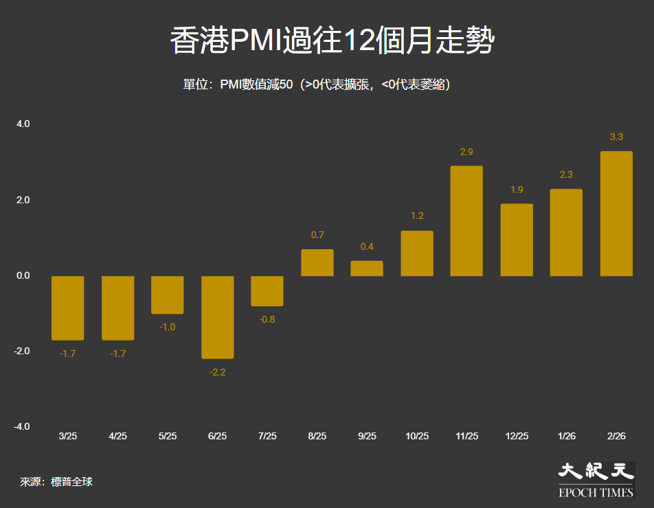 標普全球於4日公布最新香港PMI(採購經理指數),2月份錄得53.3,相比上月52.3有所增強,高於50的榮枯線,反映景氣處於擴張狀態。