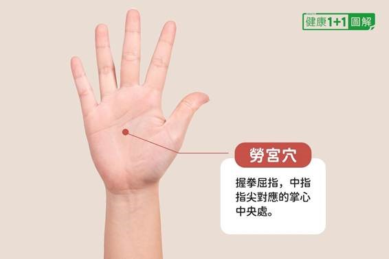 勞宮穴:位於第二、三掌骨之間,握拳屈指時的中指尖處。按摩勞宮穴有助於緩解壓力,改善水份代謝。
