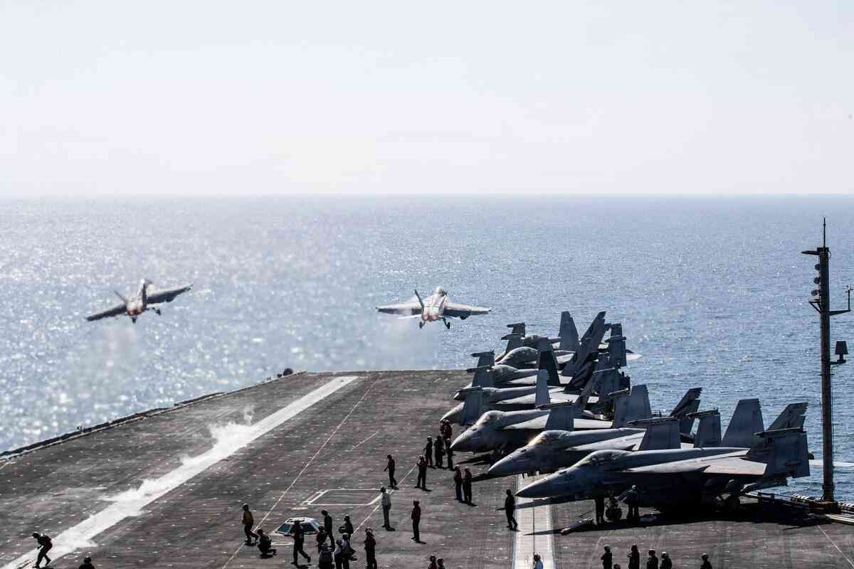 2026年3月3日,美國海軍飛機飛越「亞伯拉罕‧林肯號」航空母艦(CVN 72)的飛行甲板,支援「史詩之怒行動」。(U.S. Navy photo)