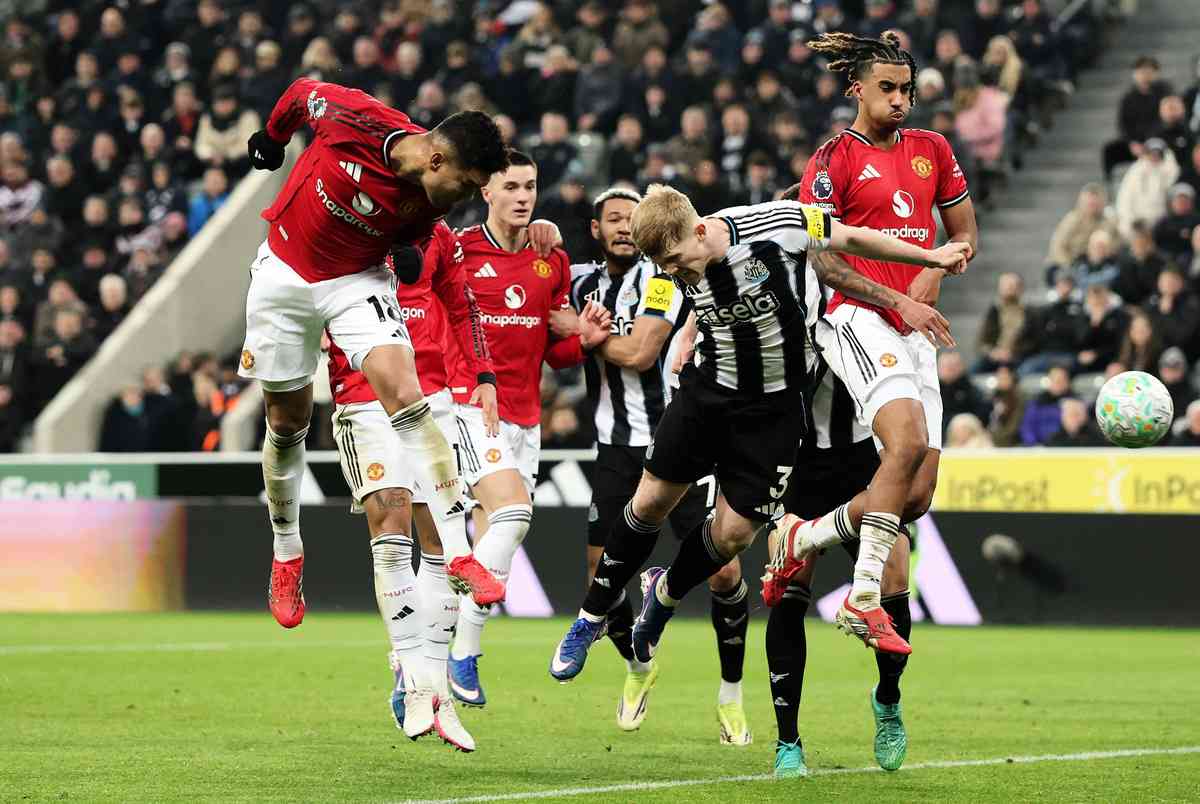 上半場比賽即將結束時,紐卡中場拿姆齊因在禁區內假摔,吃到第二張黃牌被罰下場,紐卡不得不十人應戰。隨後,B費南迪斯禁區犯規「送點」,安東尼‧哥頓操刀命中,少一人的紐卡率先取得入球。但僅過了2分鐘,B費南迪斯將功補過,開出右側定位球至門前,卡塞米頭槌攻門得手,為曼聯1:1扳平。