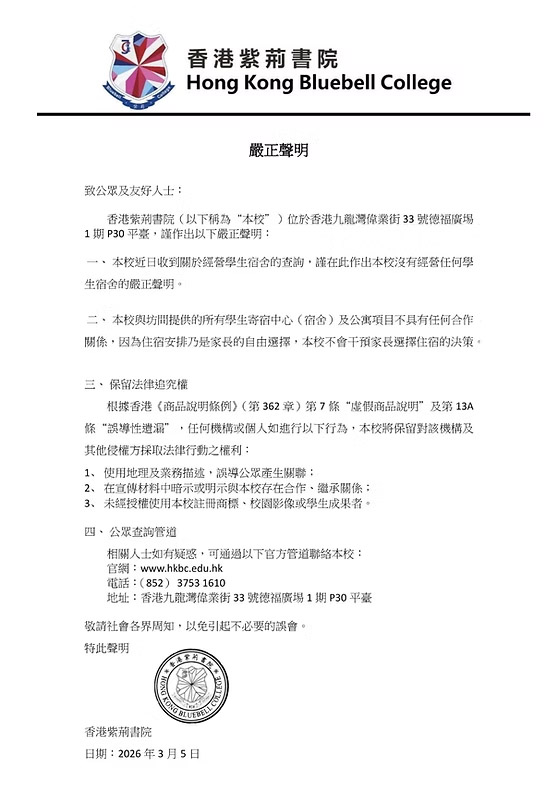 香港紫荊書院今日(6日)發表嚴正聲明,強調學校沒有經營任何學生宿舍,學校與坊間提供的所有學生寄宿中心(宿舍)及公寓項目不具任何合作關係。